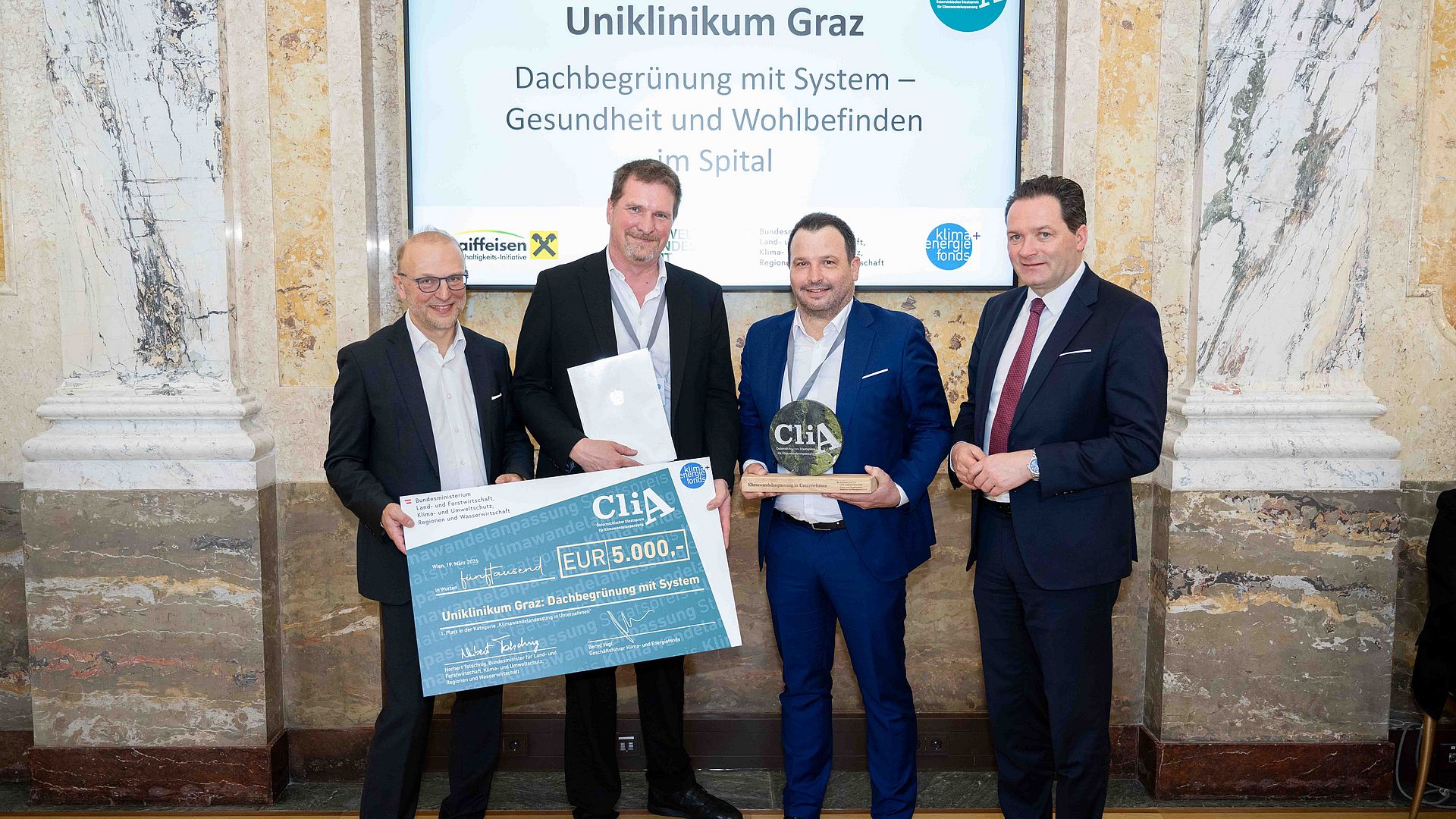 „Das Projekt verknĂŒpft ökologische, technische und organisatorische Innovation, ist in den laufenden Krankenhausbetrieb integrierbar und dient als ĂŒbertragbares Modell fĂŒr nachhaltiges GebĂ€udemanagement und Klimawandelanpassung im Gesundheitswesen“, wird das Siegerprojekt des Österreichischen Staatspreises fĂŒr CliA in der Kategorie „Unternehmen“ beschrieben, das vom Uniklinikum Graz eingereicht wurde. Am 19. MĂ€rz 2026 nahmen Christian Sixt, Leiter des Bereichs Technik, und Manfred Stangl, Verantwortlicher fĂŒr das GebĂ€ude- und Anlagenmanagement, den mit 5.000 Euro dotierten Preis entgegen.